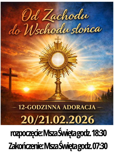Adoracja rozpocznie się 20. lutego piątkową Mszą Świętą wieczorną o godz. 18:30, a zakończy o godz. 07:00 w sobotę rano, 21 lutego 2026.