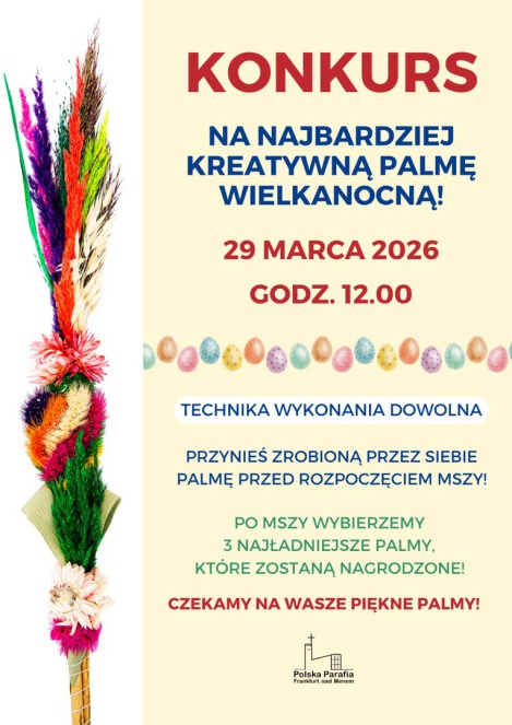 29.03.2026 Niedziela Palmowa – święcenie palm na każdej mszy św. Rozstrzygnięcie konkursu dla dzieci na najbardziej kreatywną palmę wielkanocną na mszy św. o godz. 12:00.
